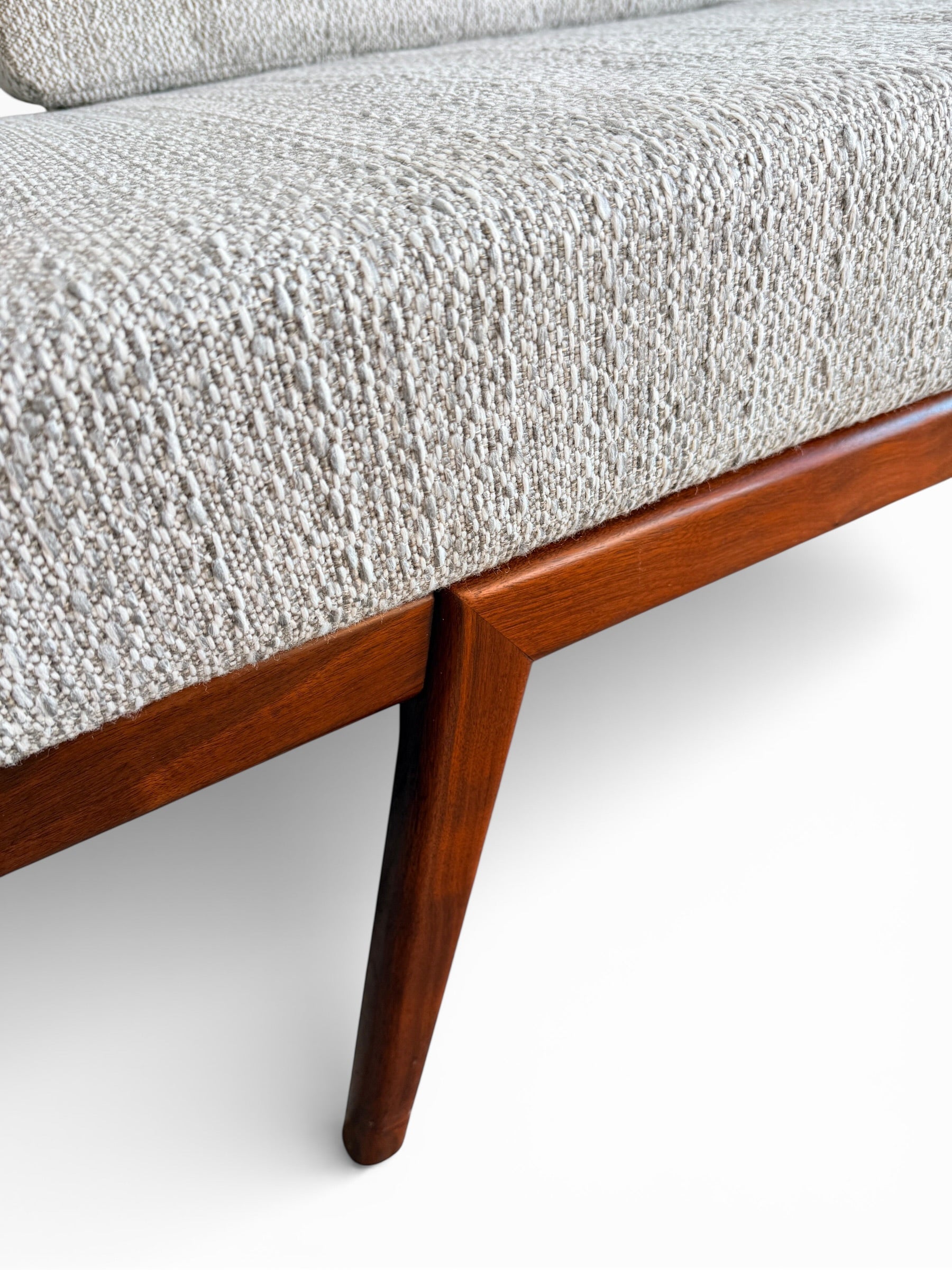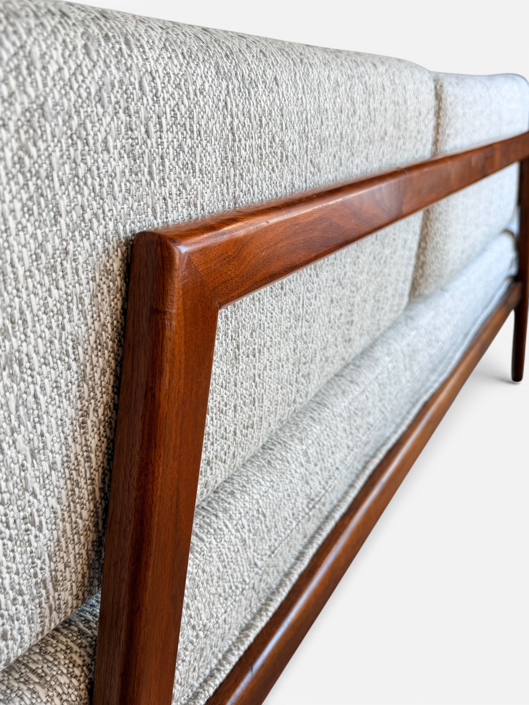 The walnut frame has a rich, warm tone with beautiful grain throughout. The sofa has been professionally reupholstered in a textured gray tweed fabric that complements the depth of the wood while keeping the overall look clean and timeless.